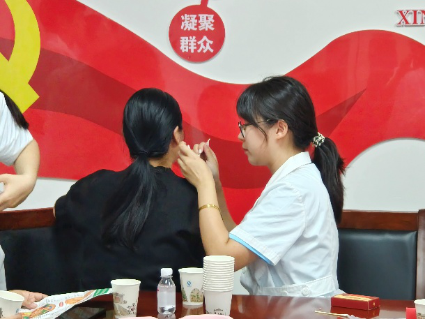 潘秋君主任全程参与活动组织,与街道工作人员、志愿者团队一道为活动提供暖心服务保障。在她的统筹安排下,活动现场不仅秩序井然、信息登记规范,还特别关注老年群体需求,为行动不便的老人提供一对一搀扶、送水等贴心服务。结合夏季时令特点,团队在潘主任的建议下开设了“中医养生小课堂”,深入浅出地讲解“冬病夏治”养生理念和常见疾病预防知识,指导居民掌握“未病先防”的健康管理方法。