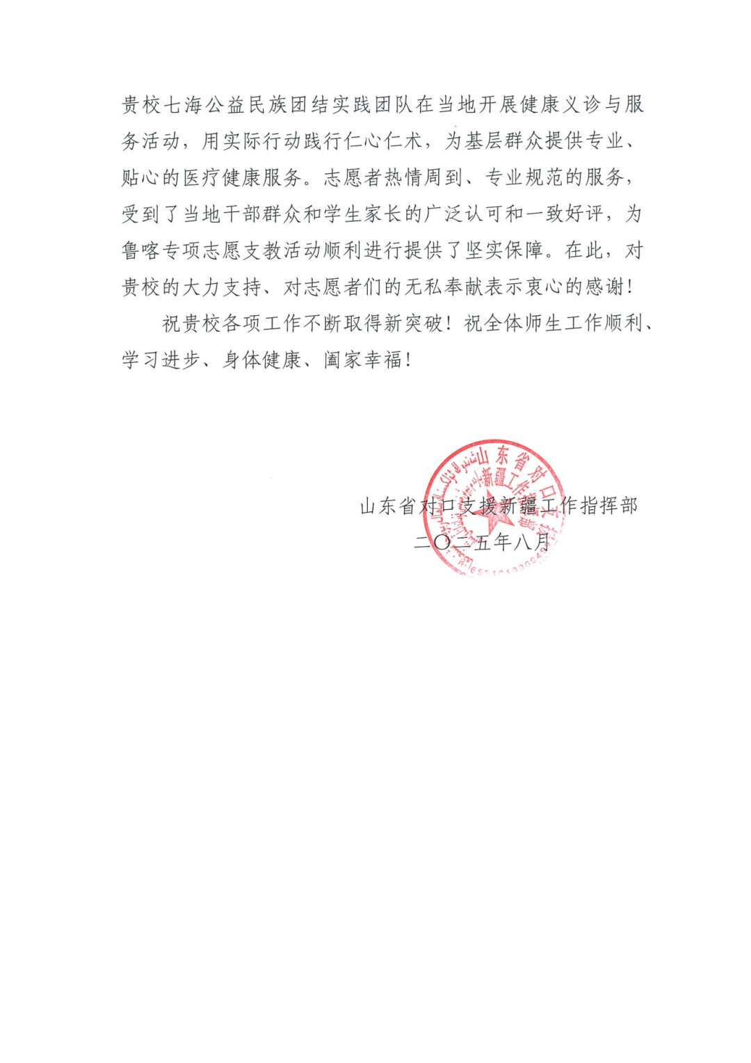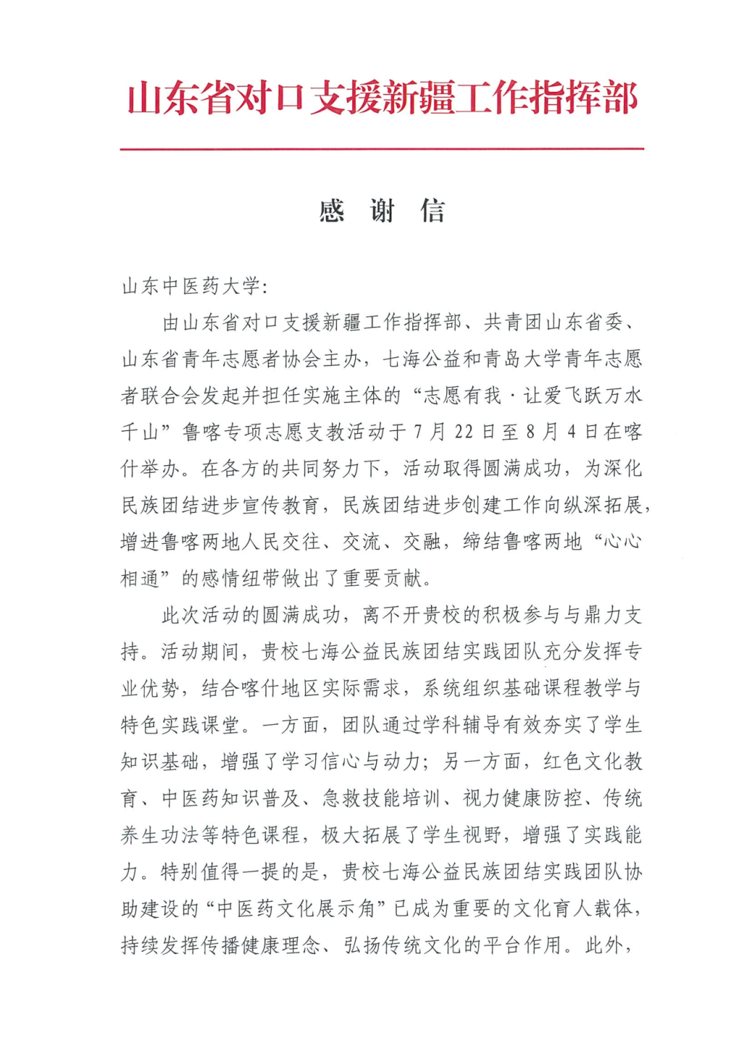 近日,山东省对口支援新疆工作指挥部向我校发来感谢信,对七海公益民族团结实践团队在支教活动中作出的突出贡献予以高度评价。信中指出,团队充分发挥中医药专业优势,构建“基础课程+特色实践”双轨育人模式,既通过学科辅导夯实学生知识根基,又创新开设红色文化教育、中医药文化普及、急救技能培训等特色课程,助力青少年开阔视野、提升素养。团队协助建设的“中医药文化展示角”已成为重要的文化育人阵地,持续发挥传播健康理念、弘扬传统文化的平台作用。此外,志愿者们深入基层开展健康义诊,以仁心仁术服务群众,其专业规范的服务赢得广泛赞誉,为鲁喀协作注入了温暖而坚实的力量。这封感谢信不仅是对团队工作的高度认可,更彰显了中医药文化在促进民族团结、服务边疆建设中的独特价值。