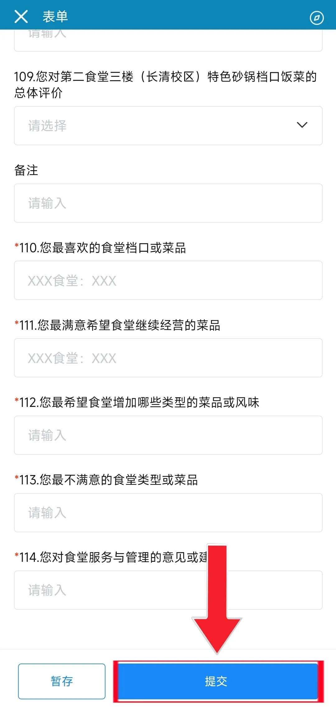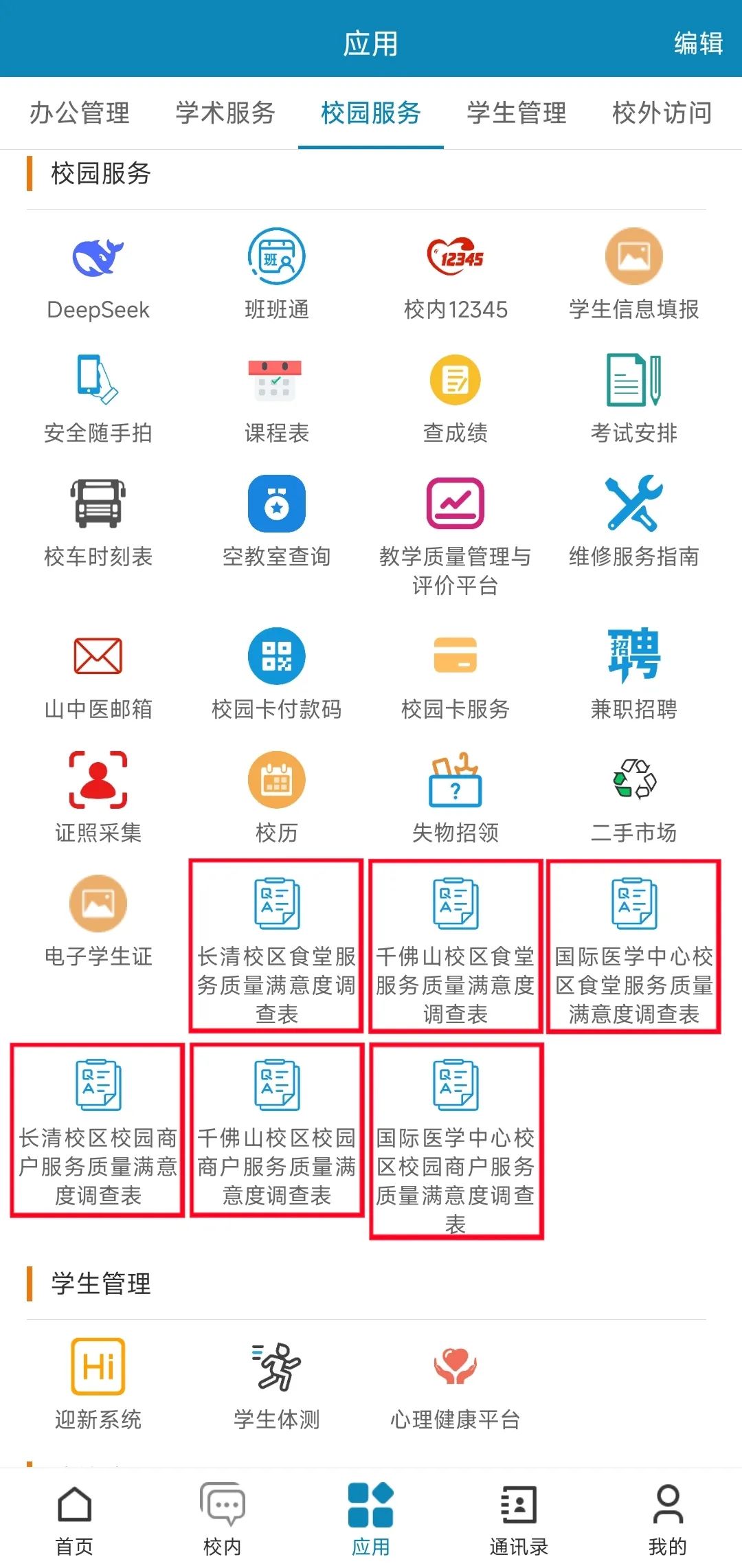 学生点击进入智慧山中医APP,进入【相应校区食堂或校园商户服务质量满意度调查表】,选择相应分数或填写建议,点击【提交】即可完成调查。